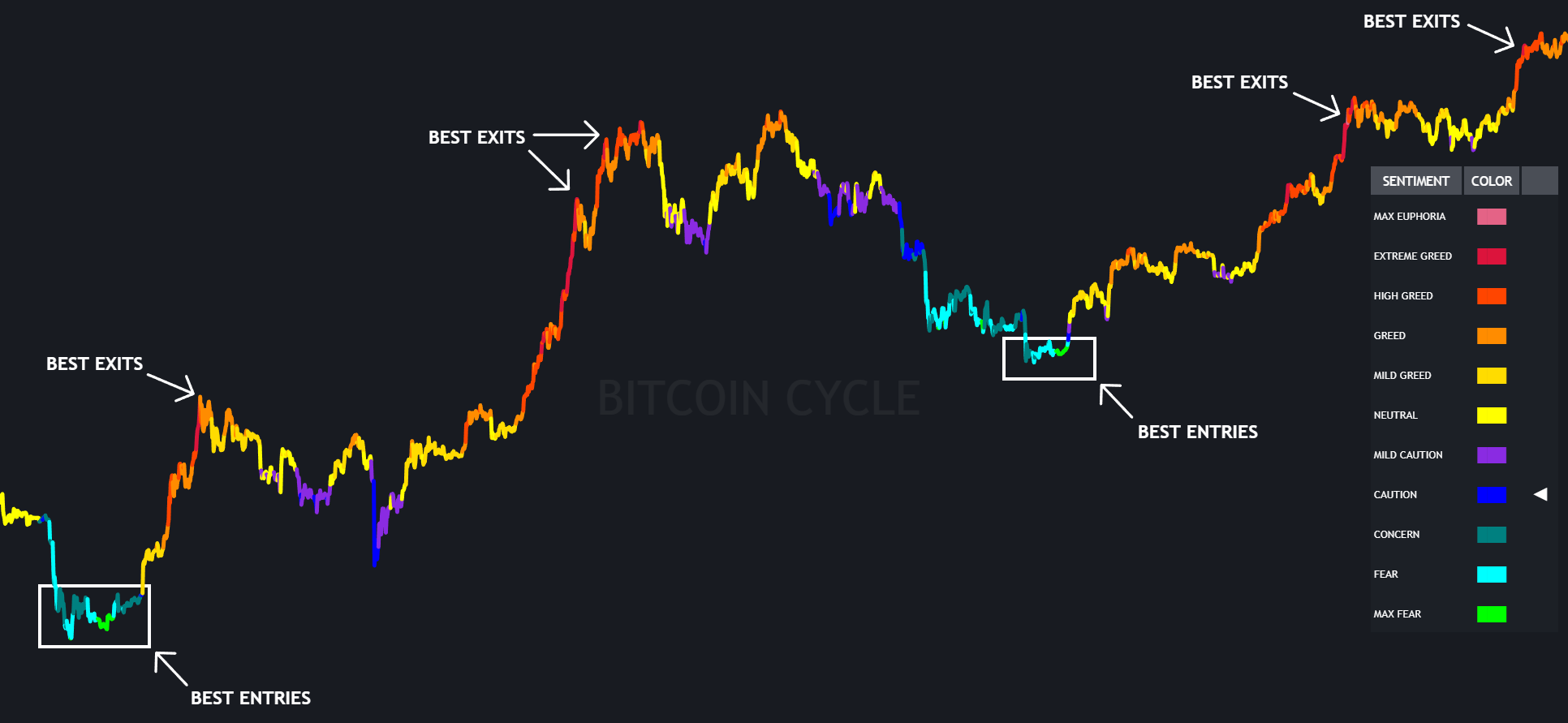 - Sell Signals → High Greed, Extreme Greed, Max Euphoria